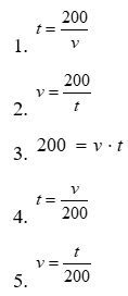 Двигаясь со скоростью v км/ч, автомобиль проезжает расстояние равное 200 км, за время t ч. Выберите формулу, выражающую зависимость времени от скорости.