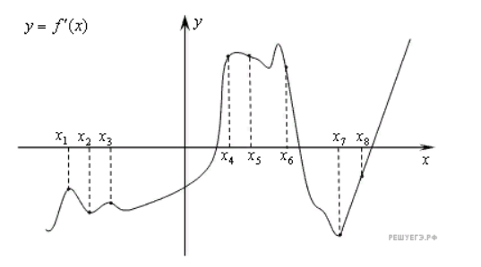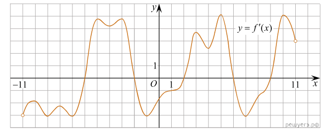 На рисунке изображен график производной функции f(x), определенной на интервале (−11; 11). Найдите количество точек экстремума функции f(x) на отрезке [−10; 10].