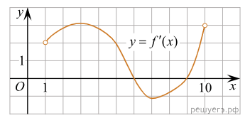На рисунке изображён график функции — производной функции f(x) определённой на интервале (1; 10). Найдите точку минимума функции f(x).