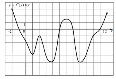 На рисунке изображен график производной функции f(x), определенной на интервале (−2; 12). Найдите промежутки убывания функции f(x). В ответе укажите длину наибольшего из них.