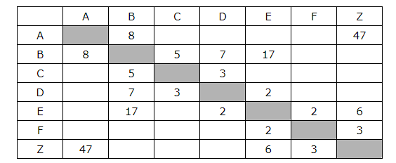 Между населёнными пунктами А, В, С, D, Е, F, Z построены дороги, протяжённость которых приведена в таблице. (Отсутствие числа в таблице означает, что прямой дороги между пунктами нет.)