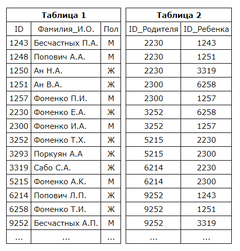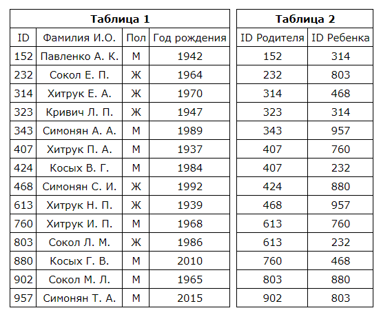 Ниже представлены две таблицы из базы данных. Каждая строка таблицы 2 содержит информацию о ребёнке и об одном из его родителей. Информация представлена значением поля ID в соответствующей строке таблицы 1. Определите на основании приведённых данных ID дяди Ващенко К. Г.