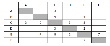 Между населёнными пунктами A, B, C, D, E, F построены дороги, протяжённость которых приведена в таблице. (Отсутствие числа в таблице означает, что прямой дороги между пунктами нет.)