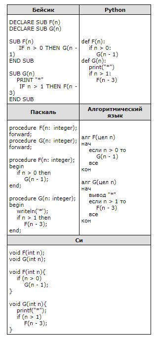 Ниже на пяти языках программирования записаны две рекурсивные функции (процедуры): F и G.