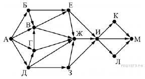 На рисунке представлена схема дорог, связывающих города А, Б, В, Г, Д, Е, Ж, З, И, К, Л, М. По каждой дороге можно двигаться только в одном направлении, указанном стрелкой.