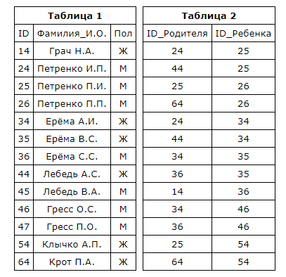 Ниже представлены две таблицы из базы данных. Каждая строка таблицы 2 содержит информацию о ребёнке и об одном из его родителей. Информация представлена значением поля ID в соответствующей строке таблицы 1. Определите на основании приведённых данных ID тёти Клычко А. П.