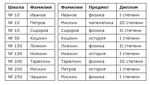 Ниже приведены фрагменты таблиц базы данных победителей городских предметных олимпиад:
