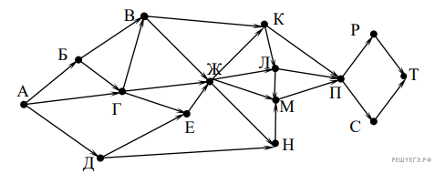 На рисунке — схема дорог, связывающих города А, Б, В, Г, Д, Е, Ж, К, Л, М, Н, П, Р, С, Т. По каждой дороге можно двигаться только в одном направлении, указанном стрелкой.