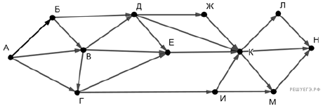 На рисунке представлена схема дорог, связывающих города А, Б, В, Г, Д, Е, Ж, З, И, К, Л, М. По каждой дороге можно двигаться только в одном направлении, указанном стрелкой.