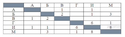 Иван-Царевич спешит выручить Марью-Царевну из плена Кощея. В таблице указана протяжённость дорог между пунктами, через которые он может пройти. Укажите длину самого короткого участка кратчайшего пути от Ивана-Царевича до Марьи Царевны (от точки И до точки М). Передвигаться можно только по дорогам, указанным в таблице: