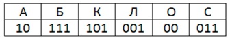 В этом сообщение зашифрован пароль - последовательность русских букв. В пароле использовались только буквы А, Б, К, Л, О, С; каждая буква кодировалась двоичным словом по таблице, показанной на рисунке.