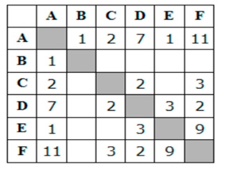 Между населёнными пунктами A, B, C, D, E, F построены дороги, протяжённость которых приведена в таблице. Отсутствие числа в таблице означает, что прямой дороги между пунктами нет.