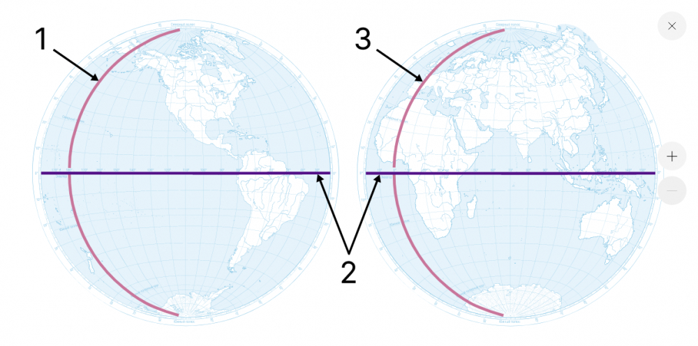 - Меридианы — условные линии, соединяющие Северный и Южный полюсы