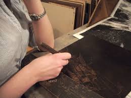 Изображение напечатано с доски, линолиума, картона на которые нанесен рисунок методом вырезания.