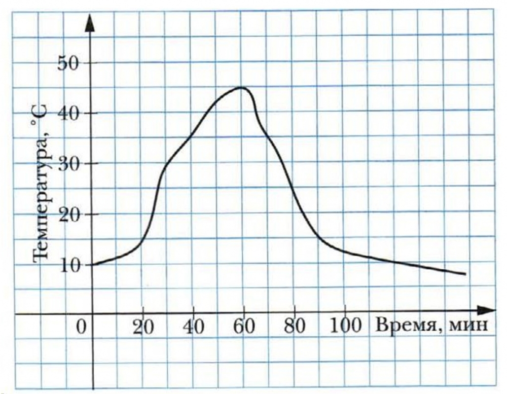 На рисунке изображен график изменения температуры раствора во время химического опыта. Какой была температура раствора через потора часа после начала опыта?
