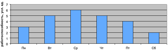 Пользуясь диаграммой работоспособности в течение рабочей недели, отметьте только ложные высказывания: