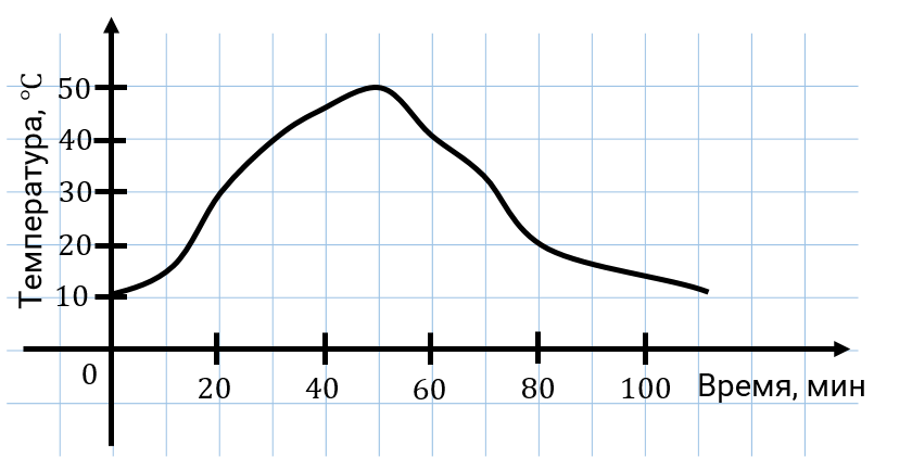 На рисунке изображён график изменения температуры раствора во время химического опыта. Установите, какой была температура через 20 мин после начала опыта.