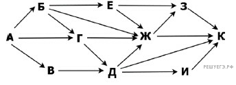 На рисунке — схема дорог, связывающих города А, Б, В, Г, Д, Е, Ж и К. По каждой дороге можно двигаться только в одном направлении, указанном стрелкой. Сколько существует различных путей из города А в город К, проходящих через город Ж?