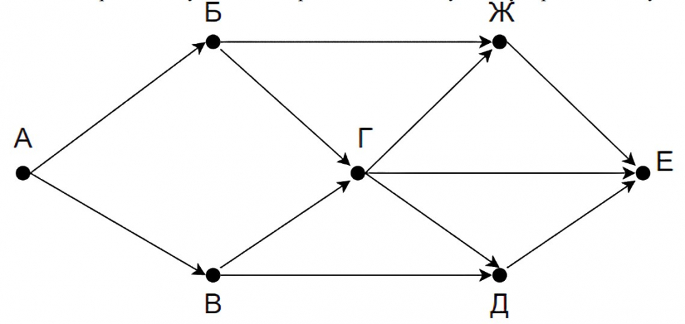 На рисунке - схема дорог, связывающих города А, Б, В, Г, Д, Е. По каждой дороге можно двигаться только в одном направлении, указанном стрелкой. Сколько существует различных путей из города А в город Е?