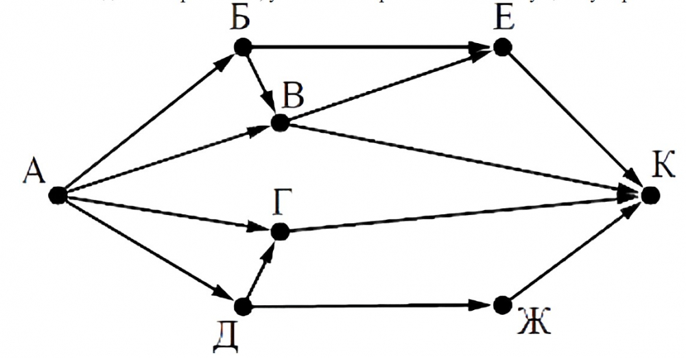На рисунке - схема дорог, связывающих города А, Б, В, Г, Д, Е, Ж и К. По каждой дороге можно двигаться только в одном направлении, указанном стрелкой. Сколько существует различных путей из города А в город К?