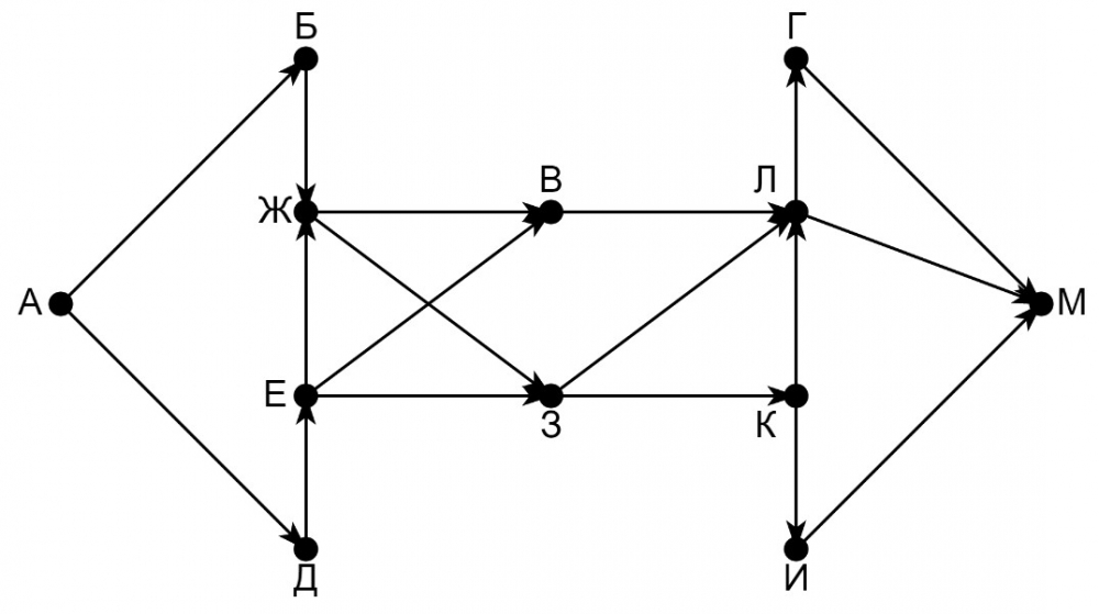 На рисунке - схема дорог, связывающих города А, Б, В, Г, Д, Е, Ж, З, И, К, Л, М. По каждой дороге можно двигаться только в одном направлении, указанном стрелкой. Сколько существует различных путей из города А в город М?