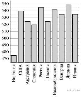 На диаграмме показан средний балл участников из 10 стран в тестировании учащихся 8-го класса по естествознанию в 2007 году (по 1000-балльной шкале). Среди указанных стран первое место принадлежит Японии. Определите, какое место занимает Словения.