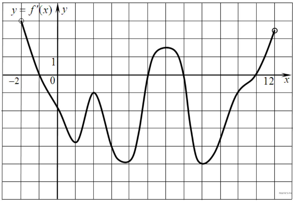 На рисунке изображен график производной функции f(x), определенной на интервале (−2; 12). Найдите промежутки убывания функции f(x). В ответе укажите длину наибольшего из них.