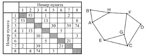 Так как таблицу и схему рисовали независимо друг от друга, нумерация населённых пунктов в таблице никак не связана с буквенными обозначениями на графе. Определите, какова сумма протяжённостей дорог из пункта G в пункт F и из пункта A в пункт H.