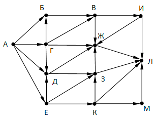 На рисунке – схема дорог, связывающих города А, Б, В, Г, Д, Е, Ж, З, И, К, Л, М. По каждой дороге можно двигаться только в одном направлении, указанном стрелкой. Сколько существует различных путей, ведущих из города А в город Л и проходящих через город Ж, но НЕ проходящих через город Б?