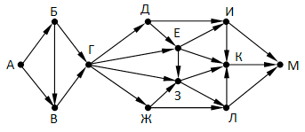 На рисунке изображена схема дорог, связывающих города А, Б, В, Г, Д, Е, Ж, З, И, К, Л, М. По каждой дороге можно двигаться только в одном направлении, указанном стрелкой. Сколько существует различных путей из города А в город М?