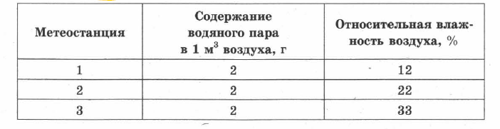 На метеостанциях 1,2 и 3 одновременно были проведены измерения содержания водяного пара в 1 м3 воздуха и определена относительная влажность воздуха. Полученные значения показаны в таблице. Расположите эти метеостанции в порядке повышения температуры воздуха на них в момент проведения измерений (от наиболее низкой к наиболее высокой)