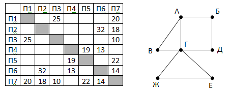 На рисунке справа схема дорог Н-ского района изображена в виде графа, в таблице содержатся сведения о длинах этих дорог (в километрах). Так как таблицу и схему рисовали независимо друг от друга, то нумерация населённых пунктов в таблице никак не связана с буквенными обозначениями на графе. Определите длину дороги между пунктами Г и Д. Передвигаться можно только по указанным дорогам.