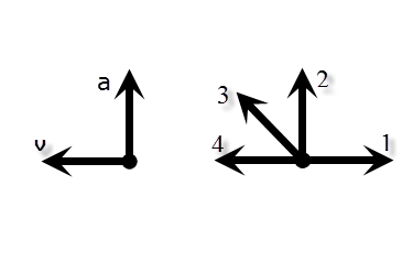 На левом рисунке представлены векторы скорости и ускорения тела. Какой из четырех векторов на правом рисунке указывает направление импульса тела?