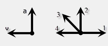 На левом рисунке представлены векторы скорости и ускорения тела. Какой из четырех векторов на правом рисунке указывает направление импульса тела?