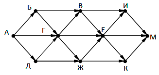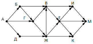На рисунке - схема дорог, связывающих города А, Б, В, Г, Д, Е, Ж, И, К, М. По каждой дороге можно двигаться только в одном направлении, указанном стрелкой. Сколько существует различных путей, ведущих из города А в город М