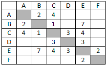 Между населёнными пунктами A, B, C, D, E, F построены дороги, протяжённость которых приведена в таблице. Отсутствие числа в таблице означает, что прямой дороги между пунктами нет. Определите длину кратчайшего пути между пунктами A и F (при условии, что передвигаться можно только по построенным дорогам).