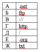 лу ftp.net , находящемуся на сервере txt.org, осуществляется по протоколу http. В таблице фрагменты адреса файла закодированы буквами от А до Ж. Запишите последовательность этих букв, кодирующую адрес указанного файла в сети Интернет.