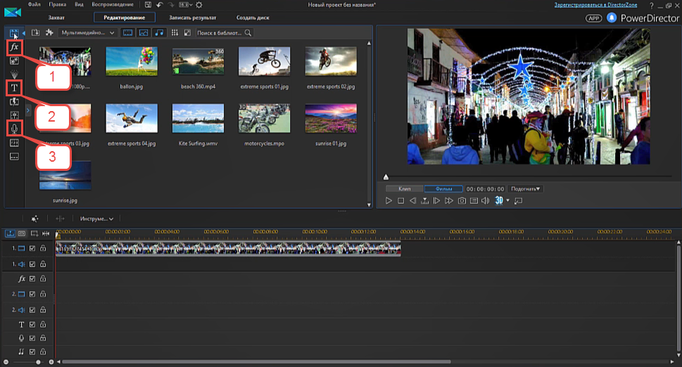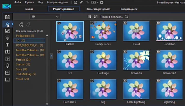 В окне программы CyberLink PowerDirector укажите на какую кнопку нужно нажать для того чтобы получить доступ к библиотеке видеоэффектов.