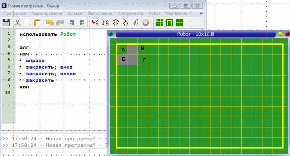 Посмотри на результат выполнения алгоритма исполнителем Робот. Из какой точки он начал движение?