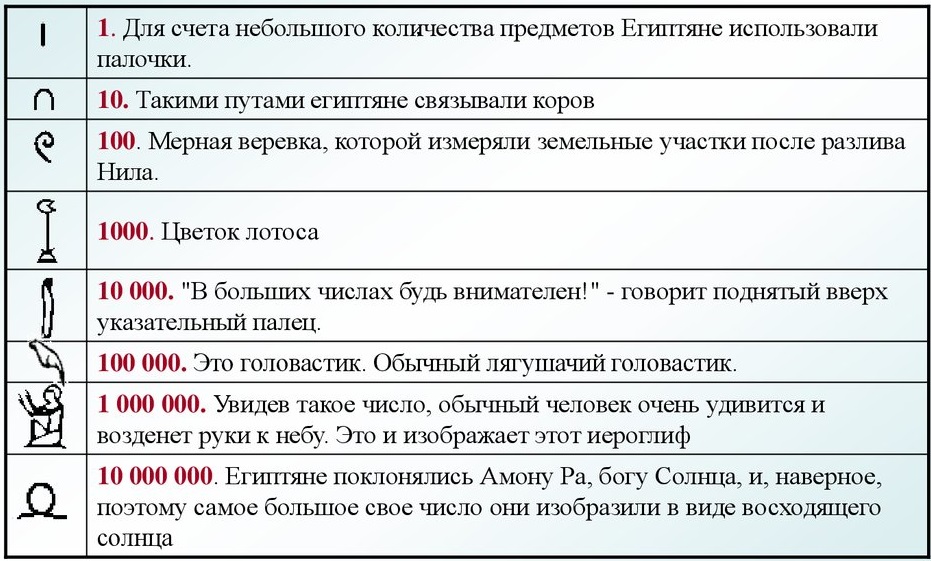 Перед вами таблица древнеегипетского способа записи чисел.