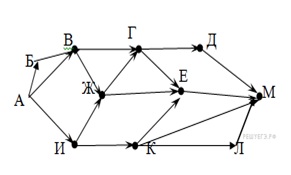 На рисунке – схема дорог, связывающих города А, Б, В, Г, Д, Е, Ж, И, К, Л, М. По каждой дороге можно двигаться только в одном направлении, указанном стрелкой. Сколько существует различных путей из города А в город M?