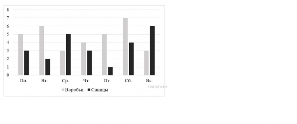 Юра повесил кормушку для птиц. На диаграмме показано, сколько воробьёв и синиц прилетало к кормушке каждый день в течение недели. В какой день недели птиц было меньше всего?