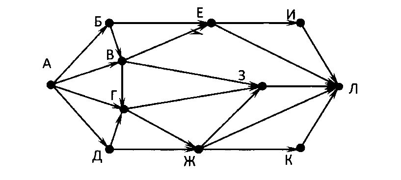 На рисунке - схема дорог, связывающих города А, Б, В, Г, Д, Е, Ж, З, И, К и Л. По каждой дороге можно двигаться только в одном направлении, указанном стрелкой. Сколько существует различных путей из города А в город Л, проходящих через город Г?