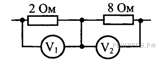 Два резистора включены в электрическую цепь последовательно. Как соотносятся показания идеальных вольтметров, изображенных на рисунке, ?