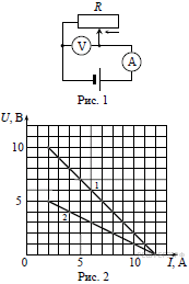 На рис. 1 приведена схема установки, с помощью которой исследовалась зависимость напряжения на реостате от величины протекающего тока при движении ползунка реостата справа налево. На рис. 2 приведены графики, построенные по результатам измерений для двух разных источников напряжения. Выберите два утверждения, соответствующих результатам этих опытов, и запишите в ответ цифры, под которыми указаны эти утверждения. Вольтметр считать идеальным.