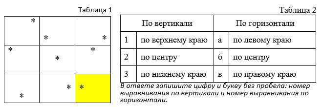 В каждой ячейке таблицы может быть использовано выравнивание текста по вертикали и по горизонтали (Таблица 1). Варианты выравнивания приведены в Таблице 2. Какое выравнивание применено к желтой ячейке?