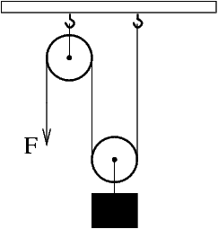 С помощью подвижного и неподвижного блоков силой F= 150 Н равномерно поднимают груз (см. рис.). Определите массу груза. Трение и силу тяжести, которые действуют на блоки, не учитывайте. Ответ______кг