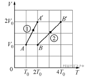 В двух сосудах (1) и (2) объёмом V0 каждый находятся одинаковые идеальные одноатомные газы. Исходные состояния этих газов соответствуют точкам А и В на VT-диаграмме (см. рисунок). Известно, что сначала давление в обоих сосудах одинаковое. Затем из исходных состояний газы переводят в новые конечные состояния А' и В'.
