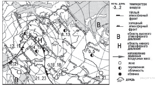 Карта погоды составлена на 15 мая. В каком из перечисленных городов обозначенных на карте, на следующий день наиболее вероятно существенное понижение температуры воздуха?