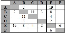 Между населёнными пунктами A, B, C, D, E, F построены дороги, протяжённость которых приведена в таблице. (Отсутствие числа в таблице означает, что прямой дороги между пунктами нет.)